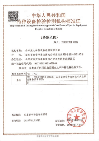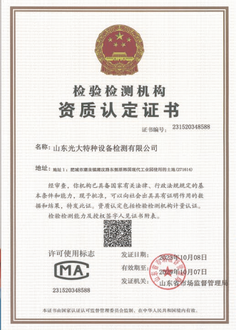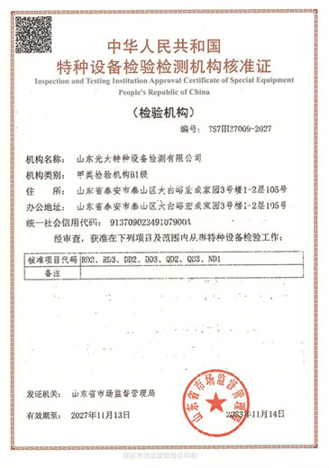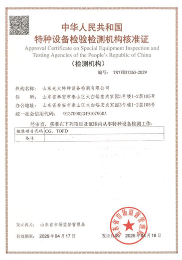 山東光大特種設備檢測有限公司是經(jīng)山東省市場監(jiān)督管理局核準的甲類B1特種設備綜合檢驗機構(gòu)。2017年9月30日取得了山東省市場監(jiān)督管理局頒發(fā)的《檢驗檢測機構(gòu)資質(zhì)認定證書》。2018年2月22日取得了山東省市場監(jiān)督管理局頒發(fā)的《特種設備檢驗檢測機構(gòu)核準證》(起重機械)檢驗檢測資質(zhì)。2021年11月取得山東省市場監(jiān)督管理局版發(fā)的《特種設備檢驗檢測機構(gòu)核準證》(安全閥在線、離線)校驗資質(zhì)。2023年11月取得山東省市場監(jiān)督管理局頒發(fā)的甲類檢驗機構(gòu)B1《特種設備檢驗檢測機構(gòu)核準證》,具有壓力容器(RD2...